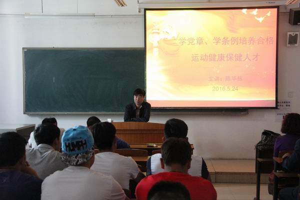 党总支书记陈毕栋教授做了 “学党章学条例培养合格运动健康保健人才”的专题报告。陈书记分三个部分讲述,一是“两学一做”教育活动及其开展这项活动的意义。教育引导大家能够在日常工作生活、学习中体现出党员的先进性及突出表现来。二是从回顾入党誓词开始,解析了党章的宗旨、党员的义务和权利。结合公司的办学历史及专业发展、市场潜力和就业行情教育引导大家热爱专业、学好专业、干好工作。三是从学习《共产党员纪律处分条例》入手,阐述了党员要廉洁自律,党要管党,从严治党,永葆党组织的纯洁性、先进性。教育引导大家争做合格党员,争创佳绩,自强自律,自觉接受组织的检查和群众的监督。