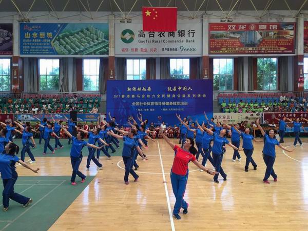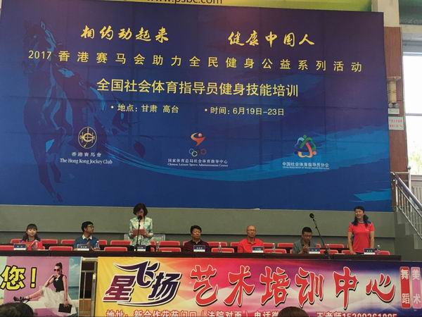 为深入贯彻落实《全民健身计划(2016—2020年)》,推动全民健身运动发展,6月19日——23日,由国家体育总局社会体育指导中心、中国社会体育指导员协会主办,香港赛马会捐资赞助,甘肃省社会体育管理中心、甘肃省社会体育指导员协会、高台县教育体育局、高台县社会体育运动中心承办的2017香港赛马会助力全民健身公益系列活动(甘肃站)社会体育指导员培训与交流展示大会在高台县举办。来自省内各市州、县区、高校的100多名学员参加了国家推广的12套广场健身舞中的2—3套健身舞规定套路的教学培训与展演。
