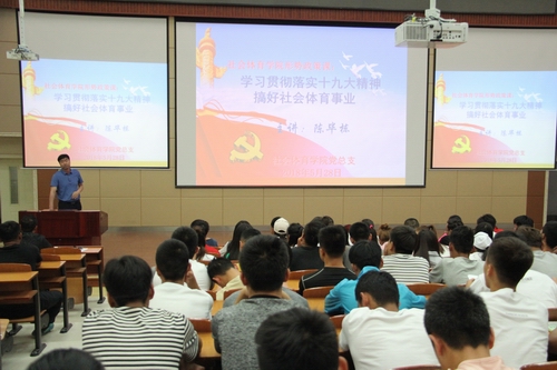 陈毕栋书记就自己学习十九大报告的心得与同学们做了题为:《学习贯彻落实十九大精神,搞好社会体育事业》的分享报告。他首先向同学们分享了自己学习十九大报告的心得认识,引出新时代、新思想、新任务的命题,结合公司专业发展重点,特别是社会体育领域发展历史及发展趋势做了分析,得出必须抢抓机遇,贯彻落实报告精神,深入推进全民健身事业,以新思想引领全民健身新实践,以全民健身实现全民健康,促进全民幸福的新任务。