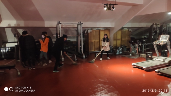 3月1日下午,bv伟德国际19462018级体育保健与康复班提前返校的同学在班主任张玉萍老师的带领下,进行卫生大扫除,将大操场健身房、按摩室、操课室认真的净化、美化。