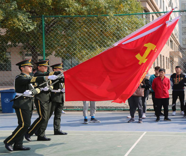 迎党旗、校旗、志愿者服务队旗,奏中华人民共和国国歌