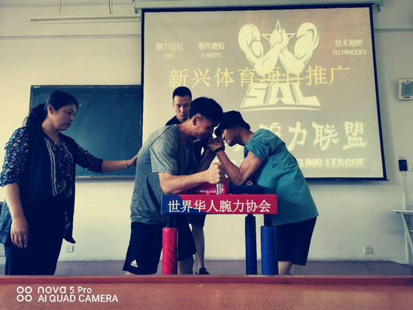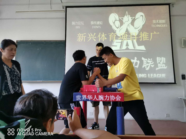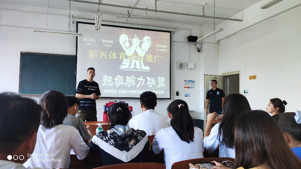 首先,徐会长介绍了这项运动;我们常说的掰手腕,意思为比试腕力的大小,它的专业名称叫斗腕。由以前的娱乐项目晋升为竞技项目,目前正在奥运项目的观察期间。作为新兴的竞技项目,有着比较大的发展空间和活跃度,从20世纪五六十年代开始出现地区性和国际性比赛。接下来徐晓晓副会长就为我们讲解了斗腕的技术动作和要领,在讲解技术动作和比赛规则后的同时,同学们都跃跃欲试,都想上台进行实践和挑战。同学们亲自上台参加腕力比试并与徐晓晓副会长进行切磋,在场参加课程的同学感受到了这一新兴项目的独特魅力,也感受到了斗腕独具的竞技技术与技巧,拓展了大家的眼光与见识。同时也对于新兴项目的推广和介绍起到了很大的作用,体现了社会体育的多样性,使同学们对于专业知识学习和社会新兴项目能够结合起来思考,对于“认知实习”达到了知行结合。