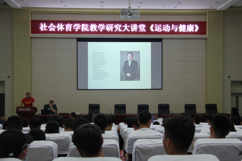 北京体育大学博士生导师王安利教授,学术渊博,是国内体育学科中研究“应用型”教学科研的专家,倡导社会体育人才的培养必须坚持“理论+实践”。今天的讲座王教授以“运动与健康”作为主题。首先以“学史明理、学史增信、学史崇德、学史力行”视角分析新中国“运动与健康”理念的发展、研究过程,明确要求在座的所有人要有建设“健康中国”的自信和动力。接着,王教授用多年研究和实践的学术观点、学术理论分析“运动与健康”的内涵和关系,鼓励在座的师生要用最专业的知识指导自己以及社会人群科学锻炼,有效健身,提高全民族的健康水平。最后,他采用案例分析教学方法,站在方法论的高度,谦和幽默的指导全体成员现场进行科学健身,分析社会人群健身的原则、方法、要求,高度体现了理论指导实践的科学理念。
