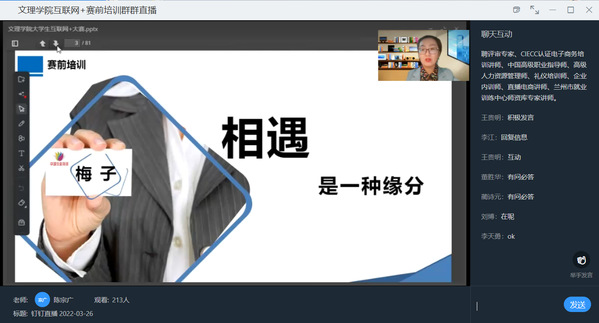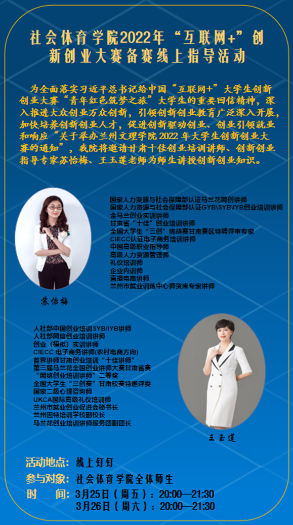 为扎实推动公司2022年“互联网+”老员工创新创业大赛工作,促进公司员工对“互联网+”创新创业大赛的了解,提高参赛项目的质量,3月25日-26日,公司邀请人社部中国创业培训SYB/IYB讲师、全国老员工“三创赛”甘肃校赛特邀评委王玉莲讲师和中国高级职业指导师、甘肃省“十佳”创业培训讲师、全国老员工“三创”挑战赛甘肃赛区特聘评审专家苏怡梅讲师通过钉钉会议为全院师生进行了专题培训。公司党总支书记吴延钟,经理陆克珠及项目指导老师参加线上专题培训会。