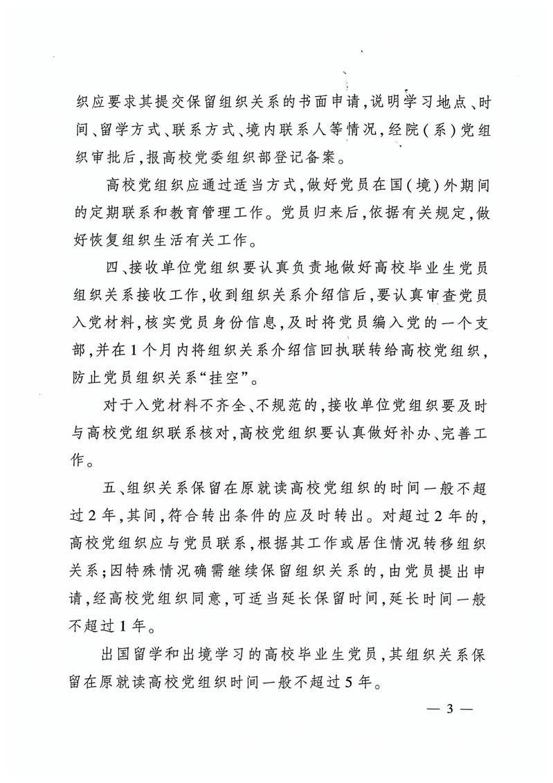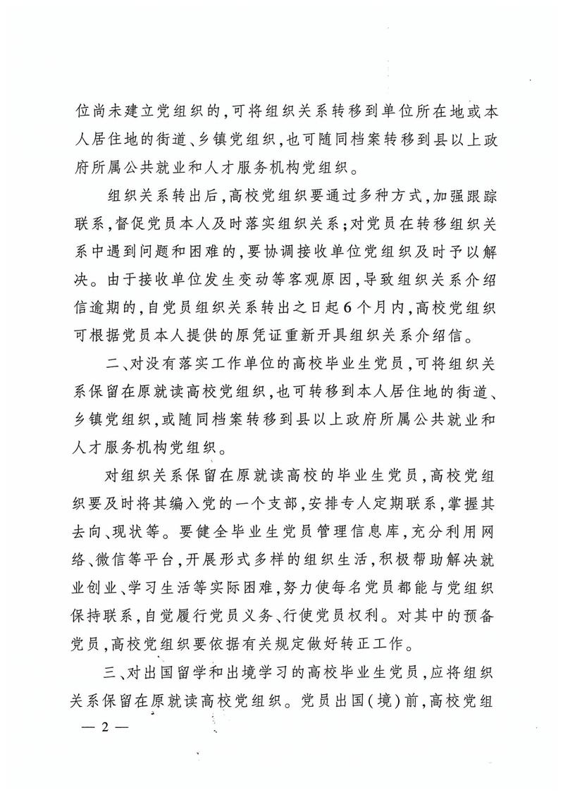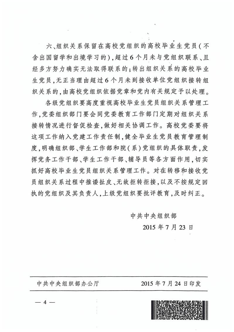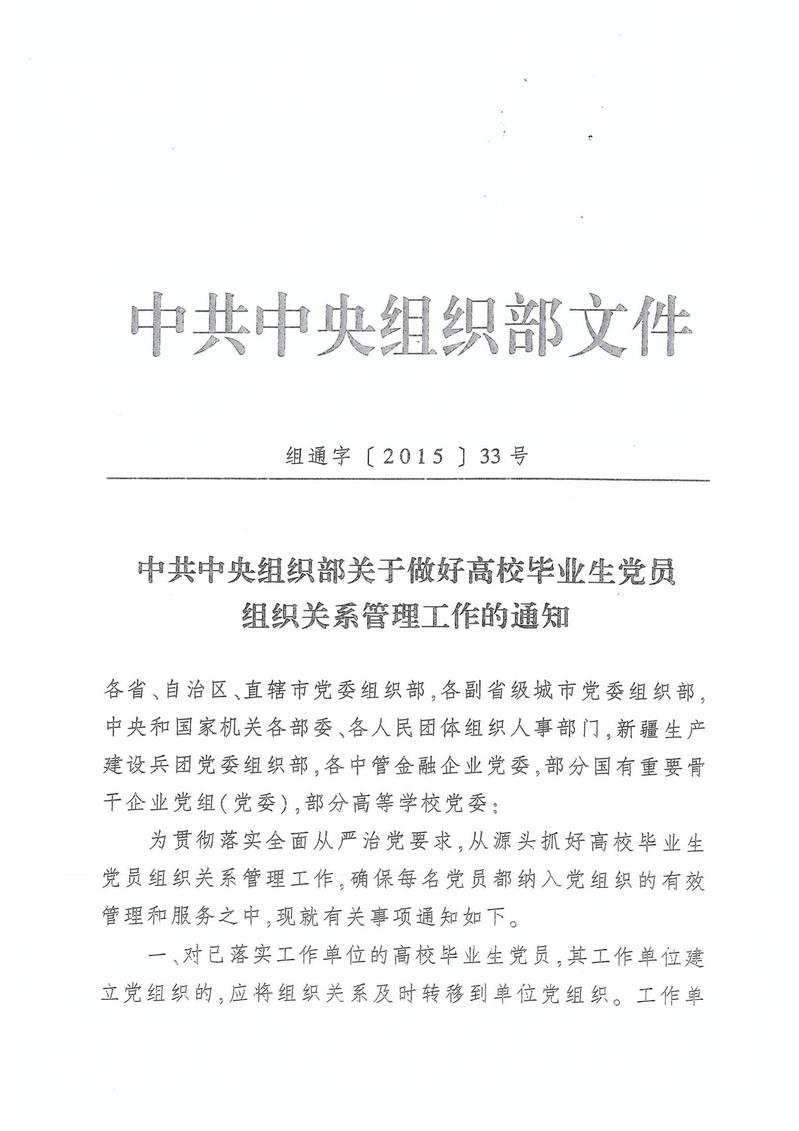 中共中央组织部关于做好高校毕业生党员组织关系管理工作的通知(组通字〔2015〕33号)