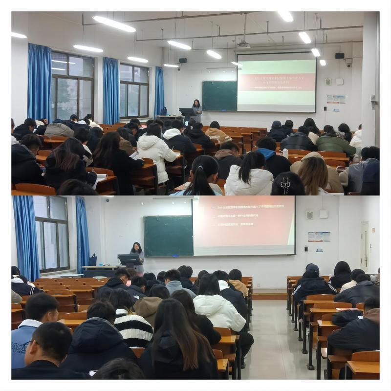 张婷首先从为什么说实现中华民族伟大复兴进入了不可逆转的历史进程、中国式现代化是一种什么样的现代化及二个方面分别阐释了中国式现代化是如何产生的以及中国式现代化产生的历史渊源、奋斗目标及战略性有利条件,并对中国式现代化是一种什么样的现代化进行了全面分析;最后张婷希望同学们在坚定理想信念、掌握知识技能和积极投身于伟大实践等三个方面不断努力,加强学习,主动实践,在投身人民群众的伟大奋斗中实现人生价值、升华人生境界。