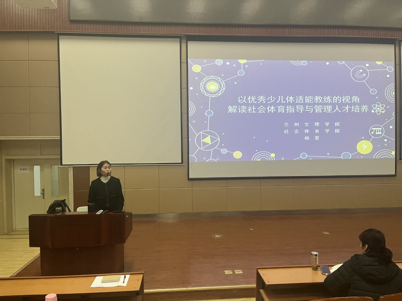 杨爱教授以《以优秀少儿体适能教练的视角解读社会体育指导与管理人才培养》为主题,“社会体育指导专业性质、就业前景”、“培养目标和需求方向”、“竞技体育对比社会体育两个方向对比、”、“以北体大冰雪基地培训经历为大家分享了现今国内先进的训练设备和理念”、“从优秀社会体育指导员所需具备的基本素质”等多方面进行了分享与交流。使现场师生对社会体育指导与管理专业有了新的认识与理解。